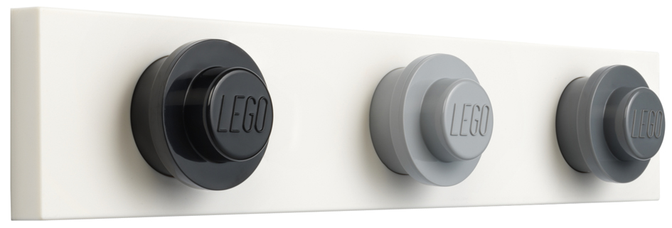 LEGO wall rack with three black/grey/dark grey hooks. White ABS strip, perfect for kids’ rooms. Easy wall mounting.