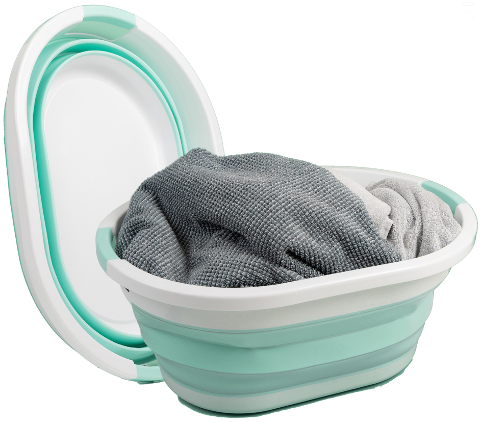 Opvouwbare wasmand (36 liter) met anti-slip handgrepen. Compact, licht en in turquoise/wit. Afmetingen: 61,5 x 45 x 27 cm.