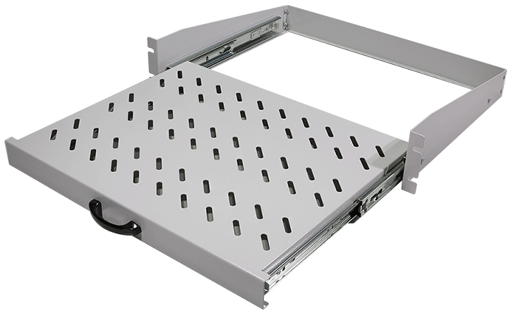 Uitschuifbaar 19 inch legbord van staal (1,1 mm), 2 HE hoog met ventilatiesleuven. Afmetingen plateau 410 x 350 mm, draagvermogen 30 kg. Inclusief bevestigingsset voor serverkasten vanaf 450 mm diepte, RAL7035.