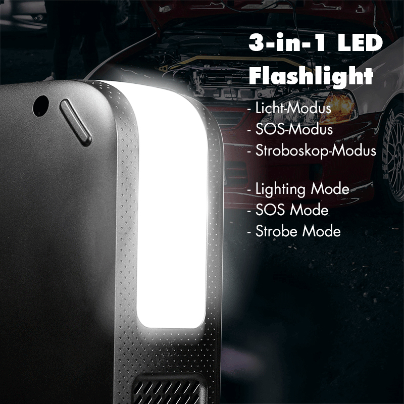 4-in-1 apparaat: jumpstarter, luchtcompressor, LED-zaklamp en powerbank. Geschikt voor lege 12 volt autoaccu’s, benzine motoren tot 4,0 liter of dieselmotoren tot 2,5 liter. Inclusief 3 ventieldoppen. Productomschrijving in het engels, Productdescription in English 4-in-1 device: jump starter, air compressor, LED flashlight and power bank. Suitable for empty 12 volt car batteries, petrol engines up to 4.0L or diesel engines up to 2.5L.
