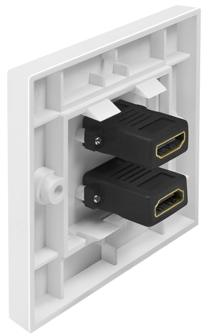 Witte opbouw wandcontactdoos met 2 HDMI aansluitingen, vergulde contacten, afgeschermd, voor schroefmontage, compleet met frame en schroeven. Productomschrijving in het engels, Productdescription in English White surface-mounted wall outlet with 2 HDMI couplers, gold-plated contacts, shielded, complete with frame.