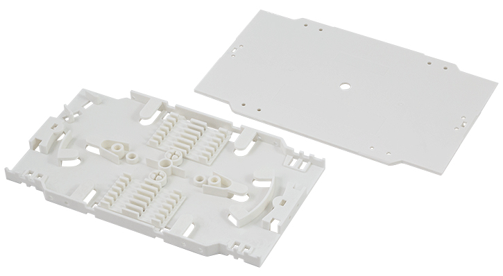Stabiele kunststof splitsplaat in wit (RAL 9003) voor maximaal 12 glasvezelsplitsingen. Afmetingen: 155x92x10,3mm. Inclusief deksel en 2x 6-voudig splitshouders. Productomschrijving in het engels, Productdescription in English Fiber optic splice tray for 12 splices, white plastic housing with cover and splice holders included.