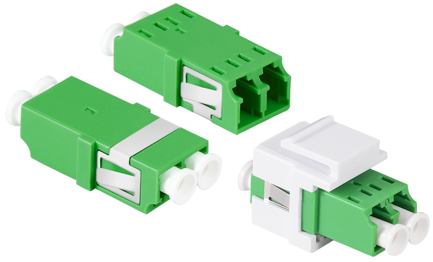 Set of 12 green LC Duplex fiber optic couplers with ceramic sleeves and mounting brackets. Includes dust caps for protection.
