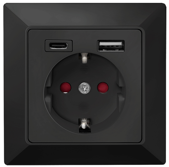Zwart inbouwstopcontact met geaard contact en verhoogde aanraakbeveiliging. Geschikt voor D/NL/A/L markten. Ingang 230V AC, 50Hz. Afmetingen: 80x40x80mm. Standaard maat voor Duitse inbouwdoos. Productomschrijving in het engels, Productdescription in English Black flush-mounted socket with earthed contact and enhanced touch protection. Input 230V AC, 50Hz. Includes 1x USB-A and 1x USB-C port. Dimensions: 80x40x80mm.