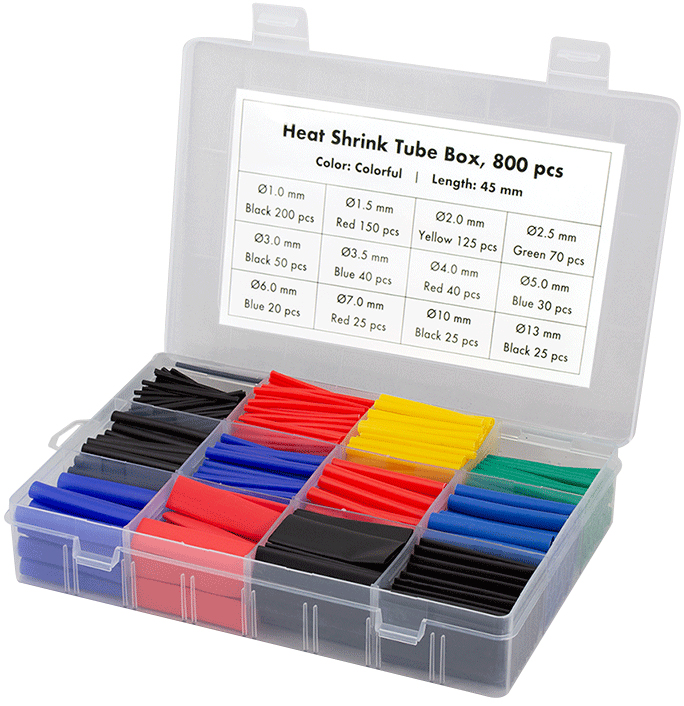 800-piece heat shrink tubing set sorted in various diameters (1.0 to 13 mm). Tube length 45 mm, shrinkage ratio 2:1. Plastic material, supplied in assortment box.