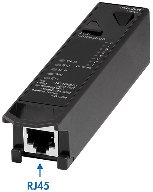 Test netwerkverbindingen en poortidentificatie voor RJ45 Cat.5e, Cat.6, Cat.6A, Cat.8.1. Batterijvoeding, inclusief patchkabel, koppeling en 8 remote stekkers. Productomschrijving in het engels, Productdescription in English Network cable tester for RJ45 connections, battery powered with patch cable and remote plugs included.
