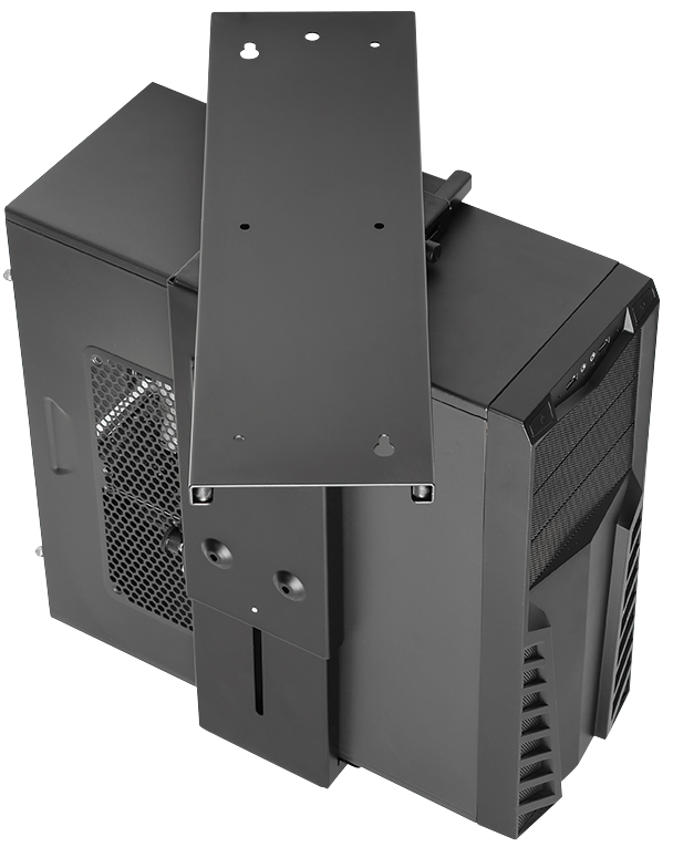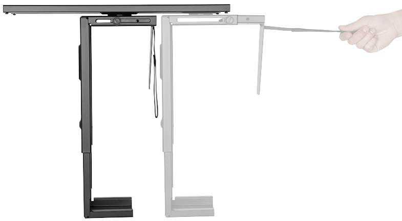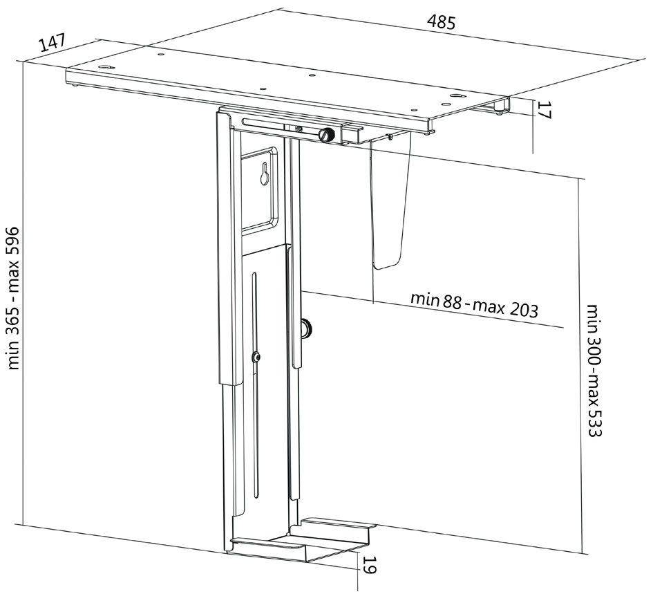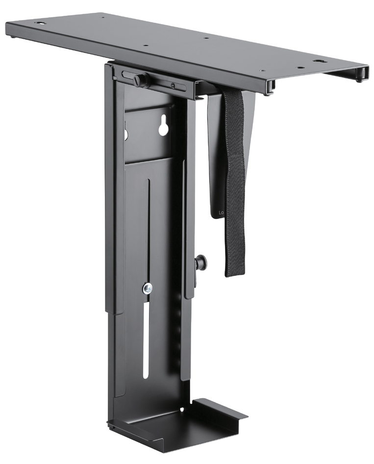 Metalen PC-houder voor montage onder bureau, in breedte en hoogte verstelbaar, 360° draaibaar met schuifmechanisme. Draagvermogen 10 kg. Productomschrijving in het engels, Productdescription in English Adjustable metal PC holder for under-desk mounting, 360° rotating with sliding mechanism, 10kg capacity.