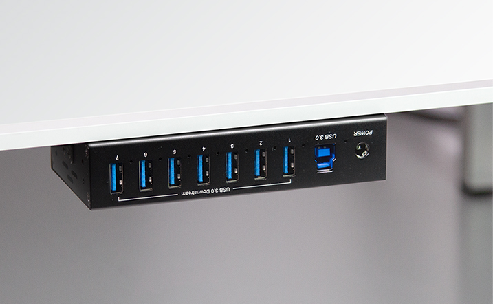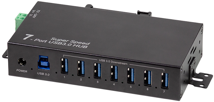 Industriële uitvoering met afgeschermd metalen behuizing. 7x USB-A poort, 1x USB-B en 1x DC-aansluiting met bevestigingsschroef. Ondersteunt USB 3.0 tot 5 Gbit/s. Inclusief netvoeding (16 V/3 A). Productomschrijving in het engels, Productdescription in English Industrial USB 3.0 hub with shielded metal housing. Features 7x USB-A ports, USB-B input and DC connector with mounting screw. Supports speeds up to 5 Gbit/s. Power supply included.