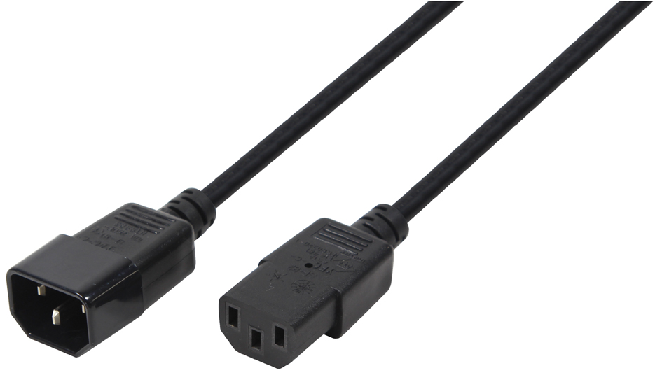 Zwarte verlengkabel voor koudapparaten met C14 stekker naar C13 koppeling, 3 meter, VDE goedgekeurd, ideaal voor IT-apparatuur. Productomschrijving in het engels, Productdescription in English Black cold appliance extension cable C14 to C13, 3 meters, VDE certified for IT equipment.