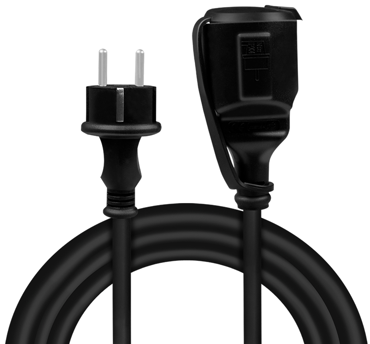 Verlengkabel met randaarde, 5 meter lang, spatwaterdicht IP44, geschikt voor Nederland. Kabel: H07RN-F 3G 1,5mm², 16A/250V. Productomschrijving in het engels, Productdescription in English Extension cord with earth contact, 5m, splash-proof IP44 rated for outdoor use.