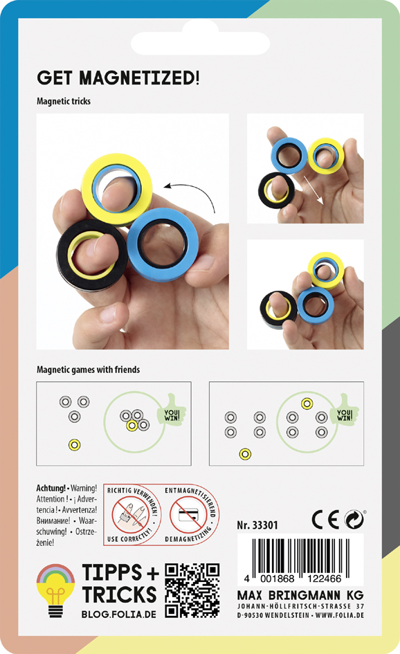 Deze magnetische spinners zijn een ontspannende bezigheid voor jong en oud. Ze bestaan uit 3 ringen met elk 6 magneetjes in de kleuren blauw, geel en zwart. Laat de ringen soepel rondraaien of vind nieuwe manieren om ze samen te voegen. Ideaal voor onderweg, in de wachtkamer of tijdens vergaderingen om geconcentreerd te blijven. Een creatieve uitdaging voor handige vingers. Inclusief handleiding. (33301)