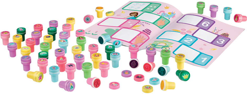 Creatieve stempelset met 52 zelfinktende prinsessen-stempels. Uitwasbaar uit de meeste stoffen. Inclusief activiteitenboekje met sjablonen. Ideaal voor kinderen van 3-6 jaar.