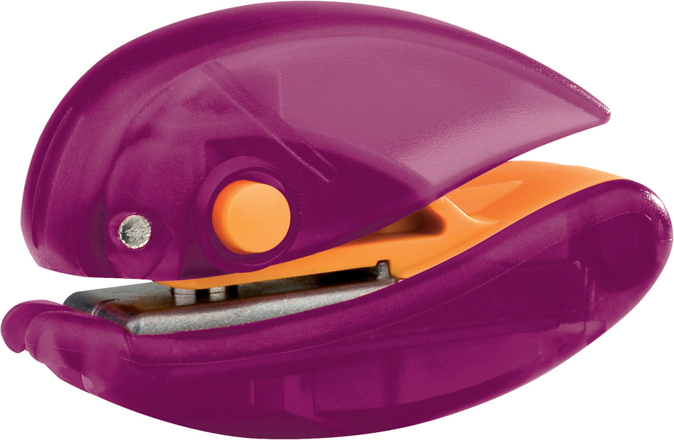 Perforeert 5 vellen, aanslag voor ordnerrringen, vergrendelknop voor gesloten positie. Geleverd in transparante kleuren blauw en paars. Productomschrijving in het engels, Productdescription in English Single hole punch, 5 sheets capacity, transparent blue and purple colors, locking button included.