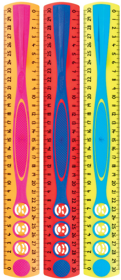 Platte liniaal met tweezijdige schaalverdeling, antislip, grote cijfers, millimeterverdeling, kleurig gesorteerd. Gemaakt van 67% gerecycled kunststoff. Productomschrijving in het engels, Productdescription in English Flat ruler with double-sided scale, non-slip grip, large numbers, millimeter divisions, assorted colors.