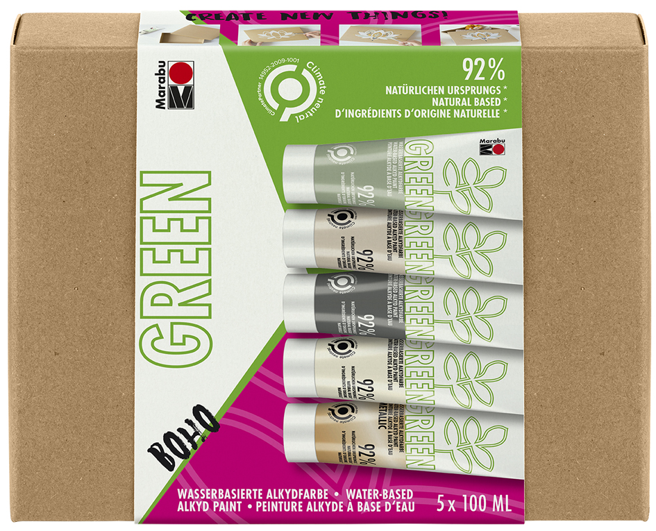 Marabu Green Watergedragen Alkydverf Boho-Set: 5 tubes van 100ml in boho-kleuren. Matte, romige consistentie. Veganistisch, weerbestendig en gemaakt van 92% natuurlijke ingrediënten.