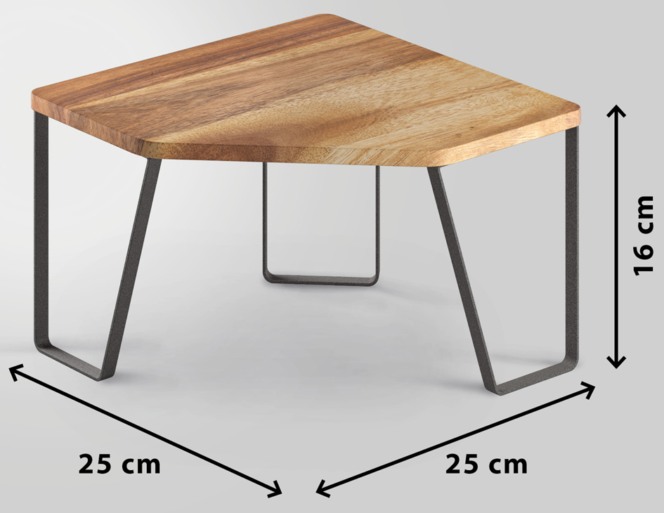 Hoekrek met geolied acaciahout, antislip voetjes, mat-zwart frame in industriële stijl. Roestvrij, krasbestendig en eenvoudige montage. Afmetingen: 250x250x160mm. Productomschrijving in het engels, Productdescription in English Corner shelf with oiled acacia wood, non-slip pads, matte black industrial frame, rust-resistant.