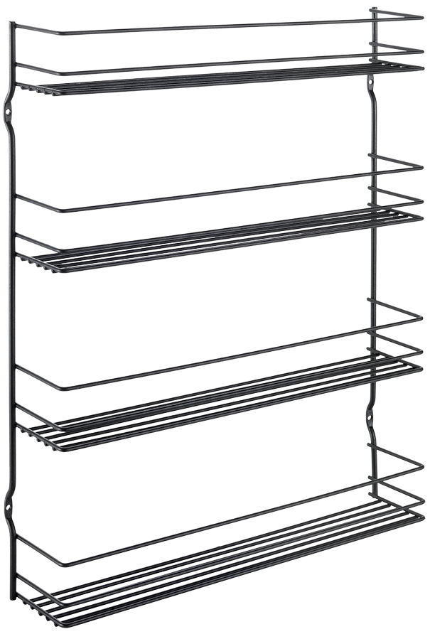 4-etages kruidenrek van gecoat metaal, roestvrij en schokbestendig. Montage aan wand, kast of deur. Afmetingen: 360x80x450mm. Productomschrijving in het engels, Productdescription in English 4-tier spice rack, rust-resistant coated metal, wall or door mounting, 360x80x450mm.