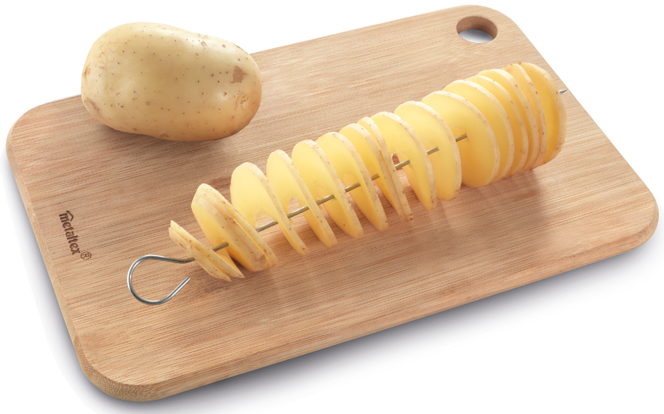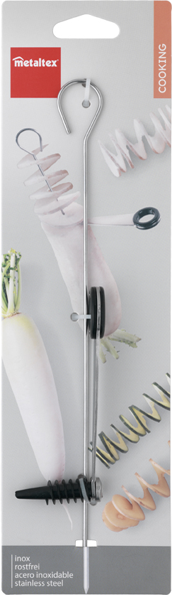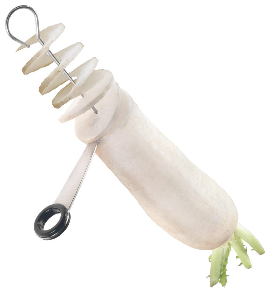Radijssnijder van RVS en ABS-kunststof met lange centreerstift en zwart mes. Geschikt voor radijs, komkommer, aardappelen en courgette. Vaatwasserbestendig voor eenvoudig onderhoud. Productomschrijving in het engels, Productdescription in English Radish slicer made of stainless steel and ABS plastic with long centering pin. Suitable for radish, cucumber, potatoes and zucchini. Dishwasher safe.