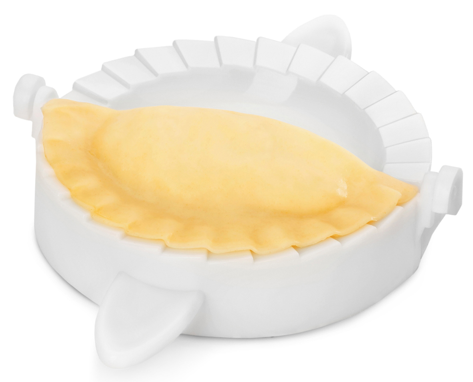 Set of 3 white plastic ravioli and pasta makers in sizes 90, 120 and 150 mm. Bottom serves as cutter. Dishwasher safe.