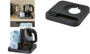 Compact black welcome tray (24x24x3 cm) made of sturdy melamine, with dedicated space for kettle, cups and accessories.