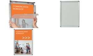 Zilver geanodiseerde aluminium klaplijst voor binnen en buiten, PVC beschermfolie, 32mm breed, 339x463mm. Productomschrijving in het engels, Productdescription in English Silver anodized aluminum snap frame for indoor/outdoor use with PVC protection film.