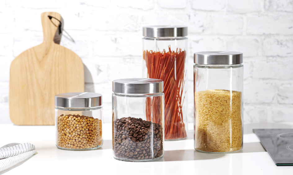 Robuuste vierkante glazen voorraadpotten met roestvrijstalen schroefverdekdeksels. Ideaal voor het opbergen van droge voedingswaren en kruiden. Praktisch en stijlvol design. Vaatwasserbestendig. Set van 4 potten. (812091)