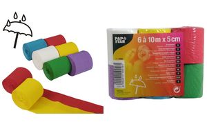Waterproof crepe paper rolls, 6 pieces (50mm x 10m) in assorted colors. Ideal for decorative purposes including maypole celebrations.