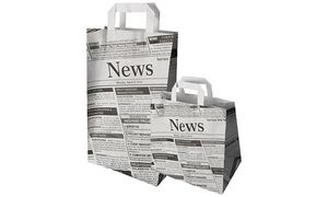 Kraftpapier draagtas met krantenprint, 70 g/m², draagkracht 5 kg. Inclusief handgrepen, verpakking van 50 stuks. Productomschrijving in het engels, Productdescription in English Kraft paper carrier bag with newspaper print, 70 gsm, 5kg capacity, pack of 50.