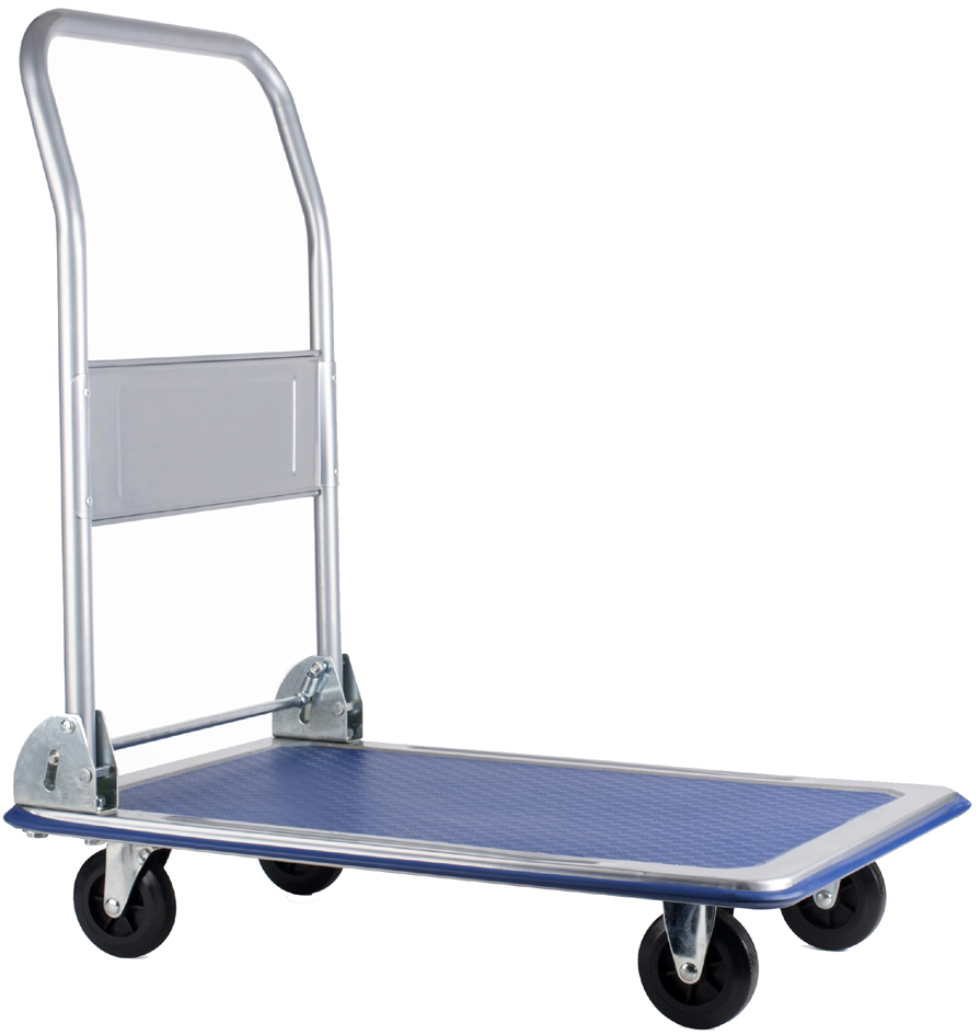 Stalen platformwagen met antislipcoating, inklapbare duwbeugel, 4 wielen waarvan 2 zwenkwielen. Draagkracht 150 kg, laadvlak 740x480mm. Productomschrijving in het engels, Productdescription in English Steel platform trolley with anti-slip coating, foldable push handle, 150kg capacity.