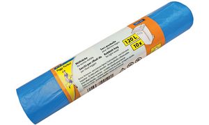 Afmetingen 700 x 1110 mm, dikte 15 my, HDPE-folie, geperforeerd, geschikt voor licht afval. 10 stuks per rol. Productomschrijving in het engels, Productdescription in English HDPE waste bags 120L, blue, perforated, 15 my thickness, 10 pieces per roll.