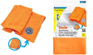 Oranje microvezeldoek met geborduurd lachgezicht en schurende hoek voor hardnekkig vuil. Afmetingen 32×35 cm, ideaal voor effectieve reiniging. Productomschrijving in het engels, Productdescription in English Orange microfiber cloth with embroidered smile and abrasive corner for stubborn dirt removal.