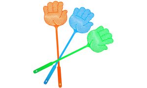 Kleurrijke vliegenmepper in handvorm van kunststof, 44 cm lang. Verkrijgbaar in oranje, blauw en groen. Kleurkeuze niet mogelijk. Productomschrijving in het engels, Productdescription in English Colorful hand-shaped plastic fly swatter, 44cm long, assorted colors orange/blue/green.