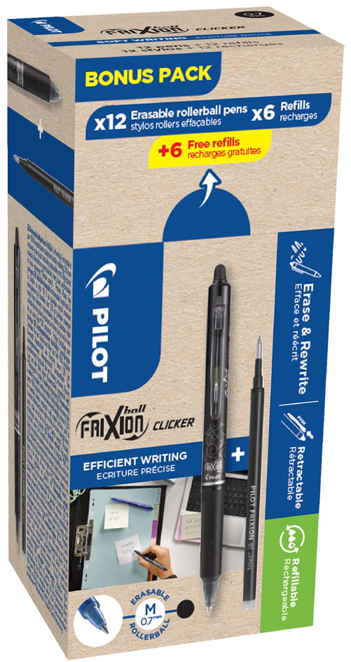 Uitwisbare gelroller met zwarte inkt, 0,35 mm lijndikte. Klikmechanisme, gummigrip en navulbaar. Set van 12 rollers plus 12 vullingen. Productomschrijving in het engels, Productdescription in English Erasable gel pen with click mechanism, 0.35mm line width, bonus pack with 12 pens and refills.
