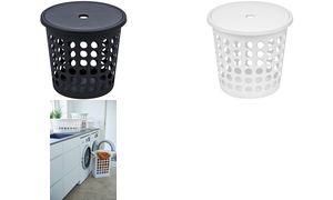 White round laundry basket with lid. Perforated PP design, 25-liter capacity. Perfect for collecting and organizing laundry.