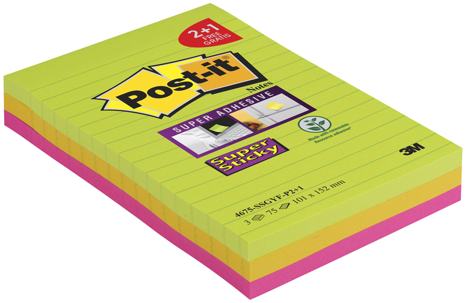 Post-it Super Sticky Notes gelineerd, 101×152 mm, 3 blokken, gekleurd