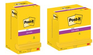 12 blokken gele Super Sticky Notes van 76 x 76 mm met 90 vellen per blok. Extra sterke kleefkracht voor verschillende oppervlakken. Geleverd in kartonnen dispenser.