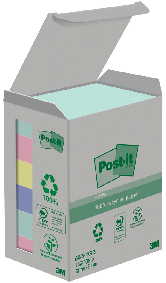 Post-it Zelfklevende notitieblokjes gerecycled, 38 x 51 mm, 4 kleuren