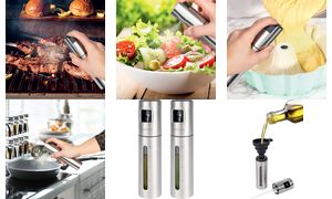 Set van 2 edelstalen verstuivers met zichtvenster en maatschaal. Inclusief pompfunctie en siliconen trechter voor eenvoudig vullen. Productomschrijving in het engels, Productdescription in English Stainless steel oil and vinegar spray bottles with viewing window, pump mechanism and silicone funnel included.