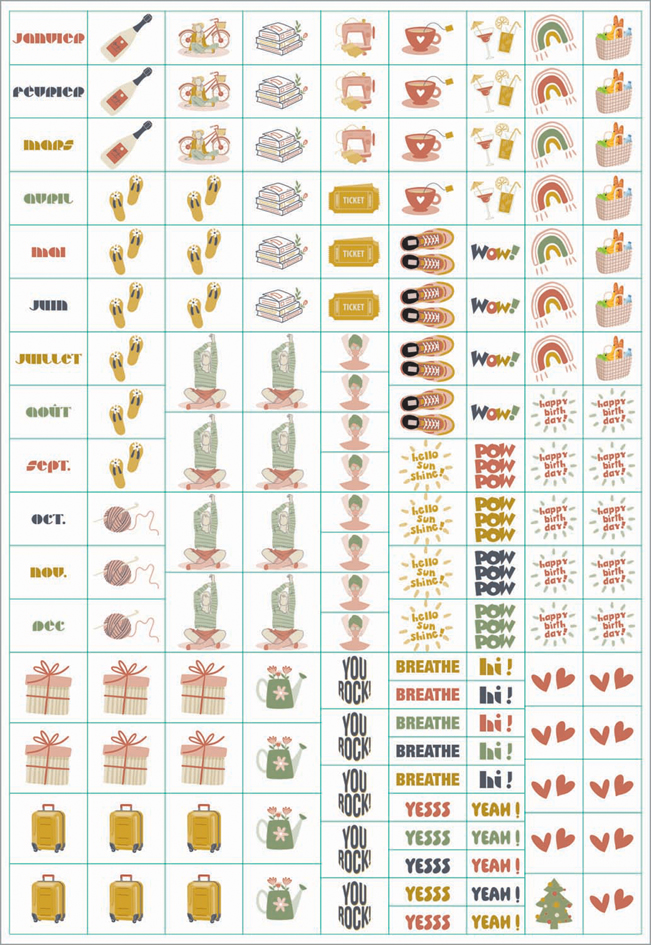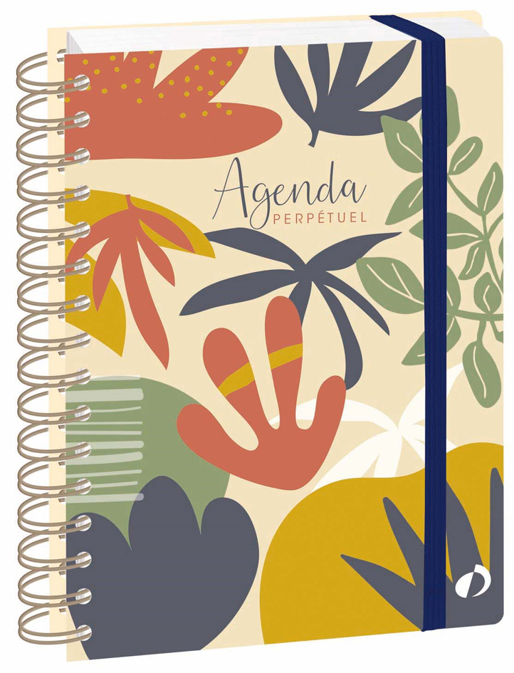 Perpetual diary with floral design. Hardcover spiral binding, elastic closure, weekly layout and storage pocket. Includes decorative stickers.