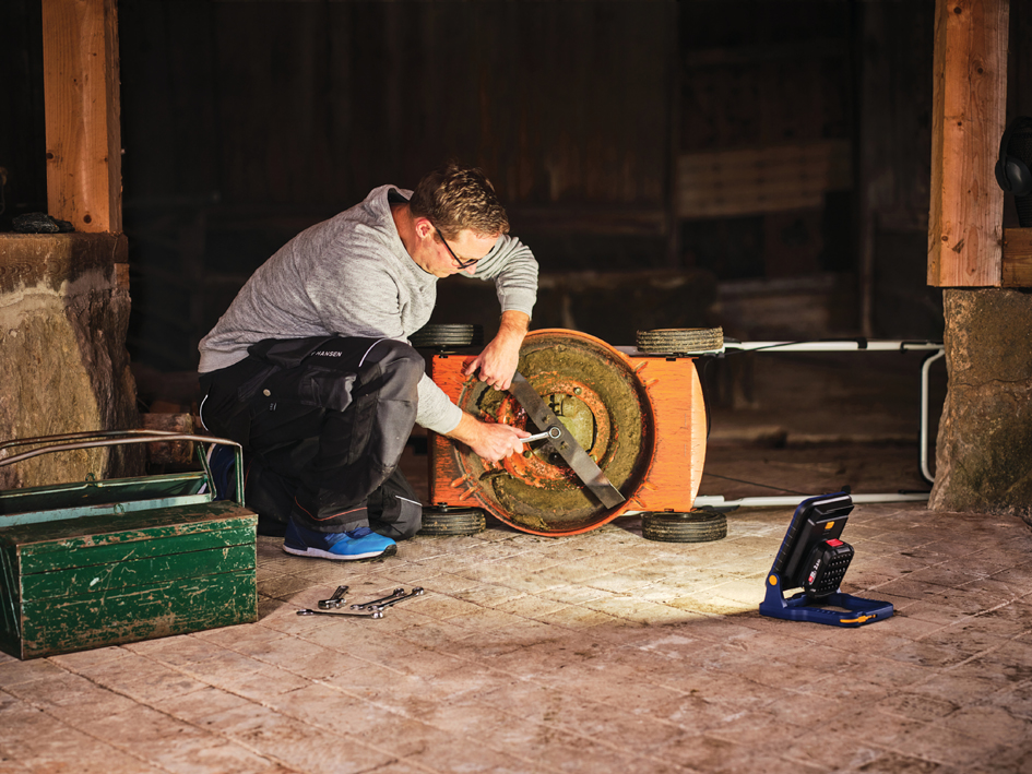 Krachtige LED-werklamp met 2.400 lumen lichtstroom en 5.000 Kelvin kleurtemperatuur. Vermogen 15 Watt, IP20, met haak en handgreep, 2 lichtmodi. Compatibel met Bosch/Gardena/Husqvarna/Wagner 18V accu’s (niet inbegrepen). Afmetingen: 194 x 105 x 242 mm. Productomschrijving in het engels, Productdescription in English Powerful LED work light with 2,400 lumens, 5,000 Kelvin, 15W, IP20 rated, hook and handle, 2 light modes, compatible with various 18V batteries (not included).