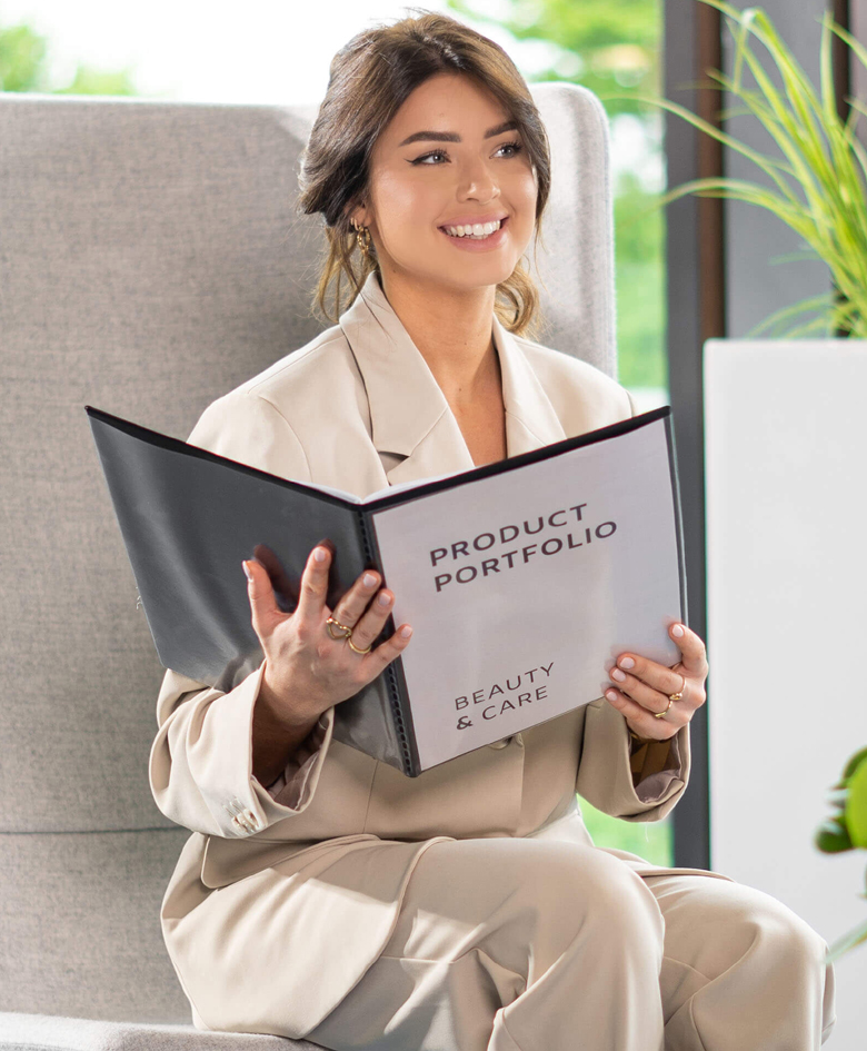 Presentatiemap A4 met 10 glasheldere PP-insteekhoezen (50 my). Stevige kunststof omslag met transparante voor- en achterzichttassen. Documentveilig en duurzaam.