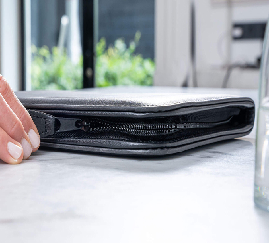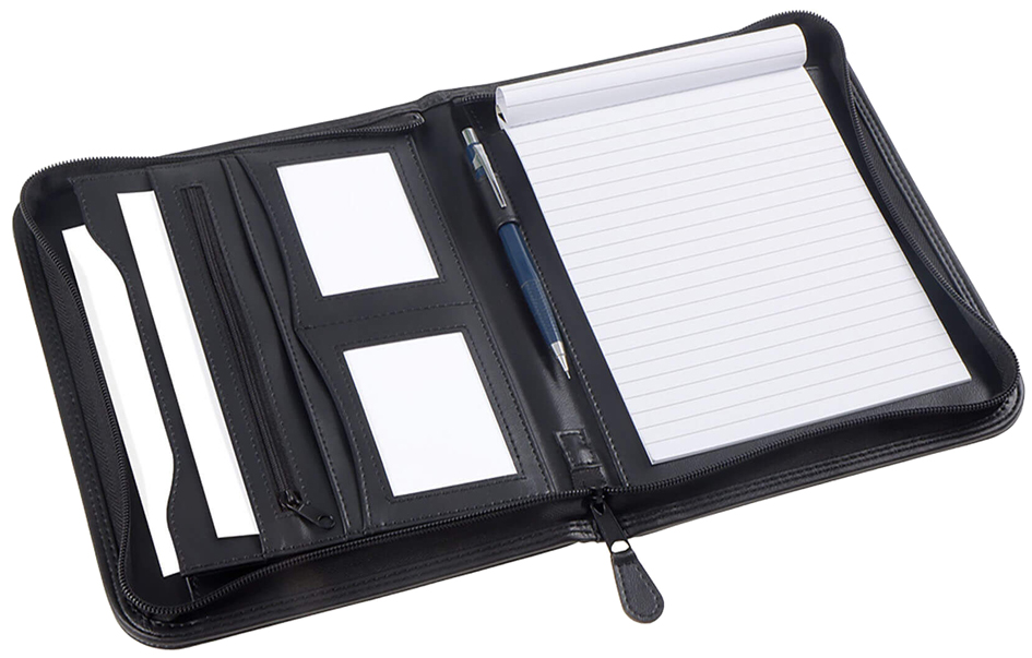 Premium A5 writing portfolio with zipper closure, document compartments and notepad. Perfect for organized note-taking on the go.