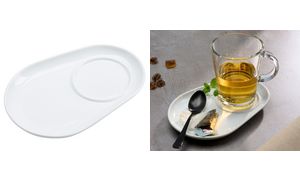 Elegante porseleinen onderzetter (12,5 x 18 cm) met ruimte voor koekjes, suiker of theezakjes. Perfect voor koffie- en theebekers. Per 6 verpakt.