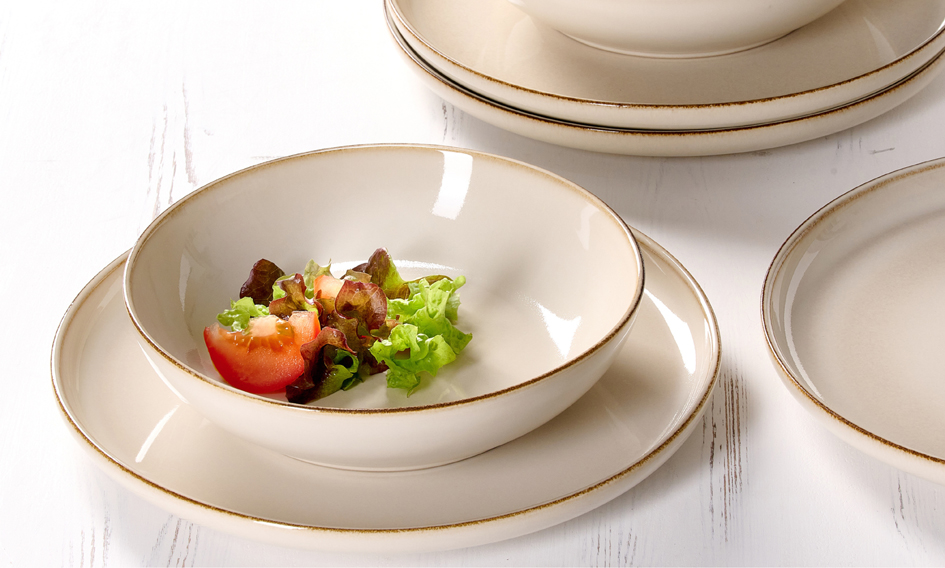 Stijlvol 8-delig OLIVIA eetservies van steengoed met reactieve glazuur. Set bestaat uit 4 dinerborden en 4 soepborden. Vaatwasserbestendig.