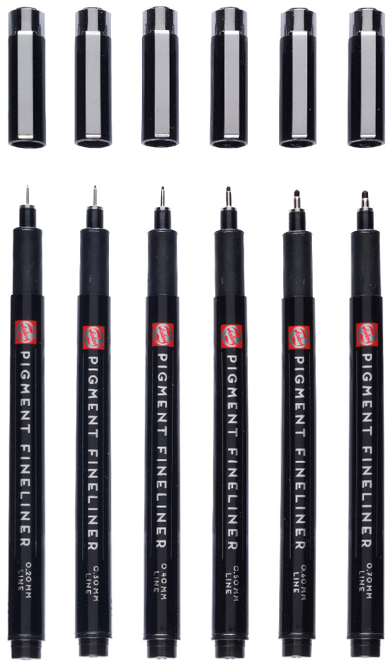 Set of 6 black pigment fineliners with water-based permanent ink, waterproof. Various line widths: 0.20 mm, 0.30 mm, 0.40 mm, 0.50 mm, 0.60 mm and 0.70 mm.