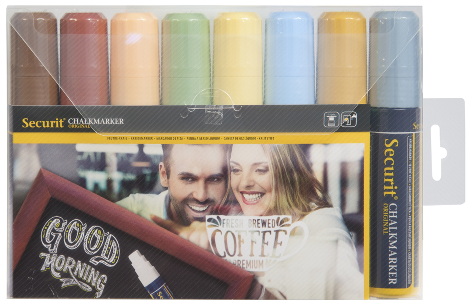 Krijtstiften met wigvormige punt, 7-15 mm lijndikte. Bestand tegen vervagen, uitsmeren en regen. 8 aardtinten kleuren. Productomschrijving in het engels, Productdescription in English Large chalk markers with wedge tip, fade and water resistant, 8 earth tone colors included.