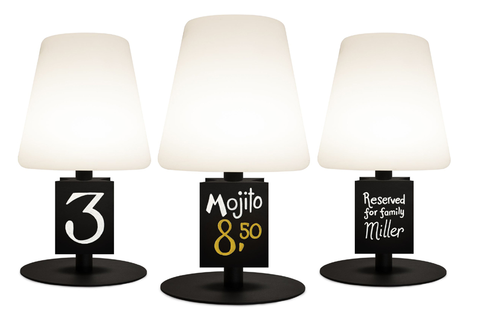 Draadloze LED tafellamp met accu (10-20 uur), dimbaar warm wit licht (3000K) en 3 tafelkaartjes. Inclusief USB-laadkabel, hoogte 275mm.