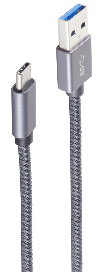 USB-A naar USB-C kabel met 10 Gbps overdrachtssnelheid. Koperen geleiders, vergoten connectoren, grijze PVC mantel, 4,2 mm diameter. Productomschrijving in het engels, Productdescription in English USB-A to USB-C cable with 10 Gbps transfer rate, copper conductors, molded connectors.