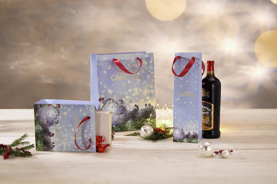 Cadeautas van wit karton 210 g/m², met kartonnen bodemversteviging en gekleurd satijnen lint als handgreep. Mat oppervlak met glansfolie. Afmetingen: 100 x 80 x 350 mm. Met opschrift ‘Merry Christmas’. Productomschrijving in het engels, Productdescription in English Christmas bottle gift bag made of white cardboard 210 g/m², with cardboard base insert and satin ribbon handles. Matte surface with gloss foil, blue/green, 100 x 80 x 350 mm.