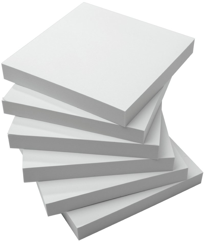 White sticky notes made from recycled paper, 80 g/m², 100 sheets per pad. Solvent-free adhesive. Package contains 6 pads, perfect for office use.